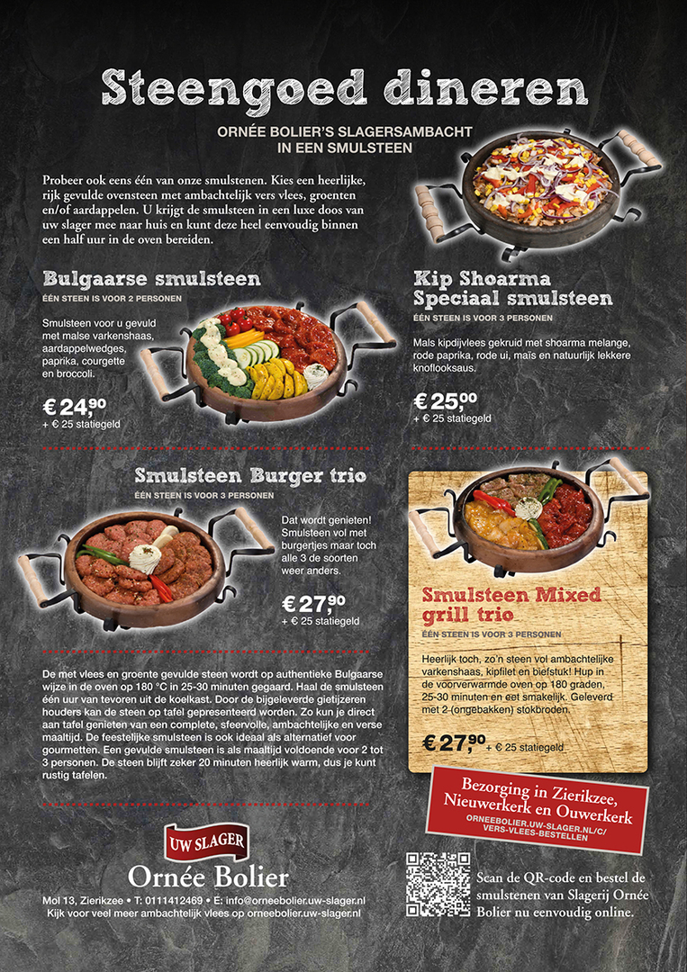 Wie van echt lekker eten houdt is hier aan het juiste adres. Wij staan iedere dag voor u klaar met specialiteiten uit eigen keuken en het lekkerste vlees. Daarnaast kunt u bij ons ook prima terecht voor een mooie saladeschotel, een lekkere hapjesschotel of een buffet op maat. Kijk eens rustig rond in onze online winkel. Krijgt u trek van al dat lekkers? Kom dan naar onze slagerij aan de Mol 13 en wij laten u graag iets proeven! Uw Slager staat voor lekker, ambachtelijk eten! Zowel voor uw dagelijkse maaltijd als speciale momenten. Genieten van een verjaardag, een huwelijk of de feestdagen kan het beste met Uw Slager. Voor alle gelegenheden, het hele jaar door, hebben wij altijd iets passend in huis voor u. Wij adviseren en inspireren u graag om van de speciale momenten, onvergetelijke momenten te maken.